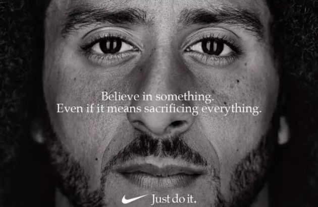 https://note.com/t_yoshioka/n/n671e38596596コリン・キャパニック氏は有色人種差別に抗議するためにNFLの試合前の国歌斉唱中の起立を拒否。その行為をきっかけに、彼は2016年シーズン終了から今までNFLでプレーできていない。NIKEは、2018年に展開した”Just Do It”30周年キャンペーンにコリン・キャパニック氏を起用。「何かを信じろ。たとえそれですべてが犠牲になるとしても。」というコピーとともに話題となった。